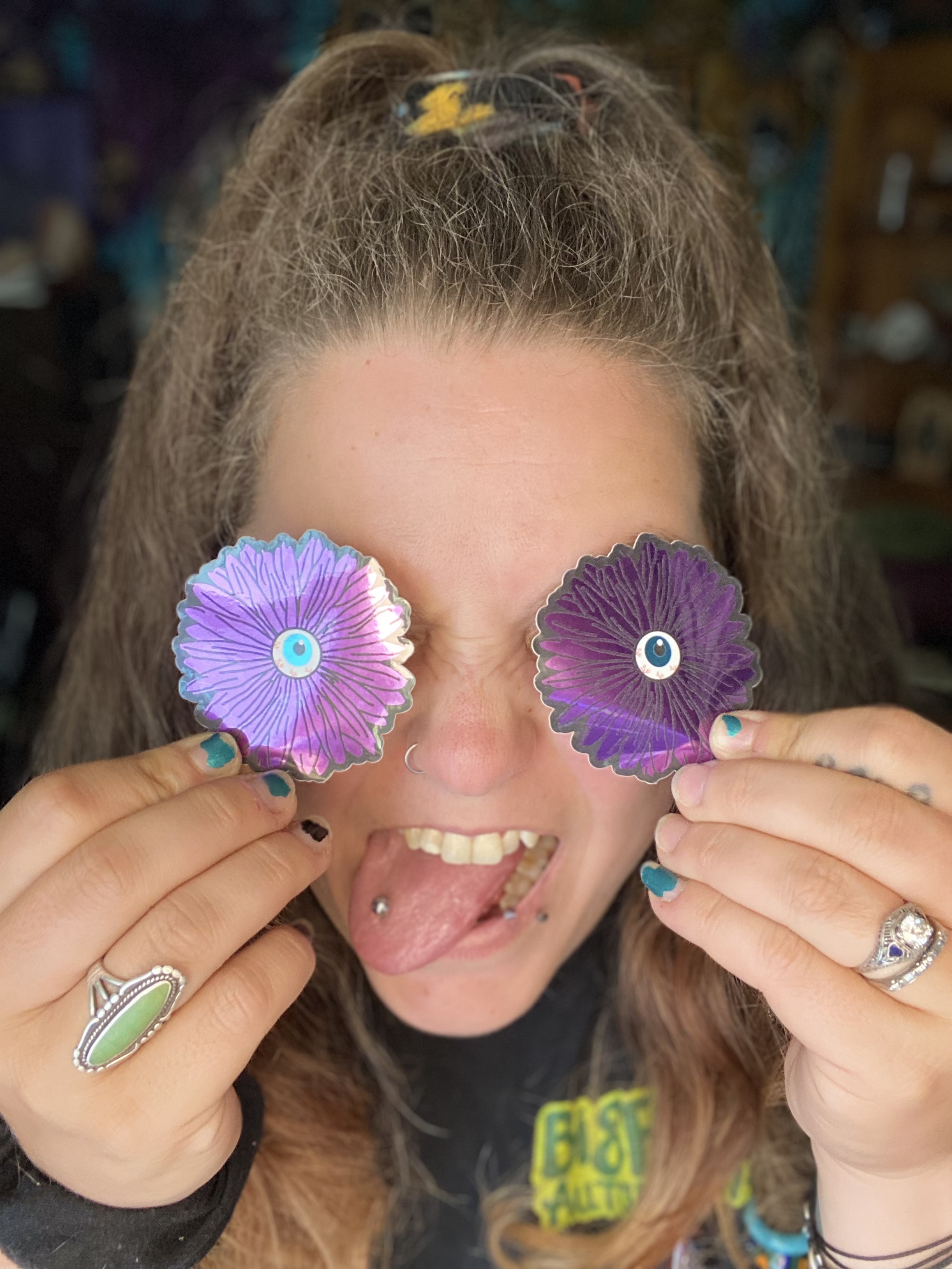 I'm all eyes for you! Weather resistant, purple mirror eyeball daisy.
